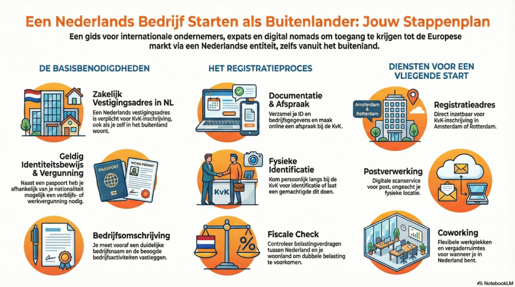 | 1. Vestigingsadres | Een fysiek adres in NL (verplicht) | Rechtsgeldig adres in Amsterdam of Rotterdam |