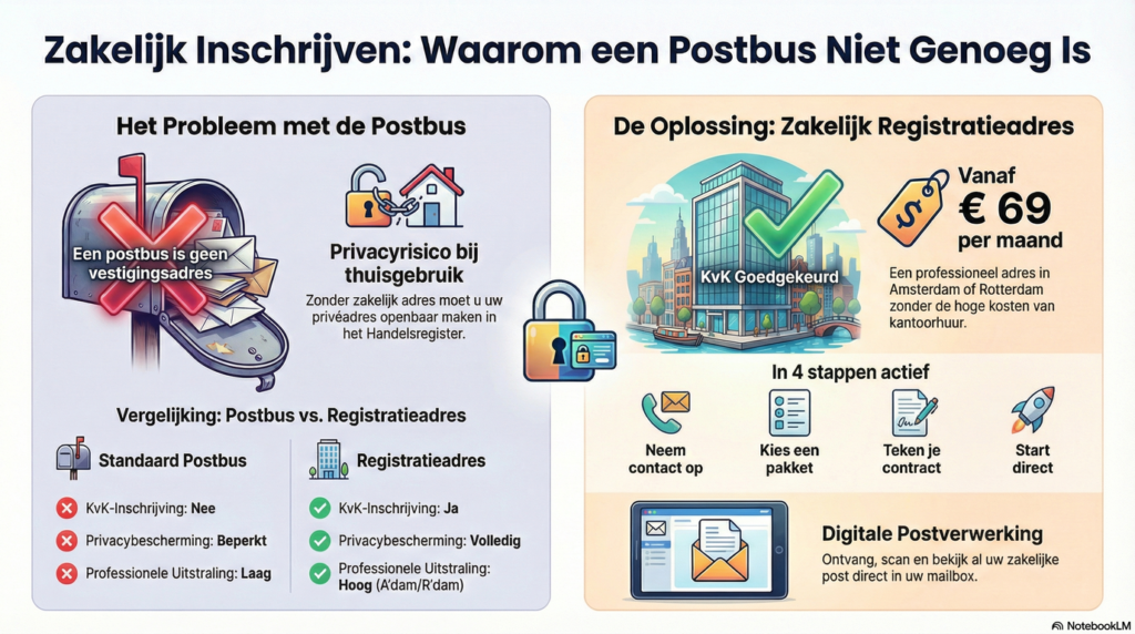 Een zakelijk postadres is bedoeld voor het ontvangen van zakelijke post. Het wordt niet geregistreerd bij de KvK en dient puur als correspondentieadres.