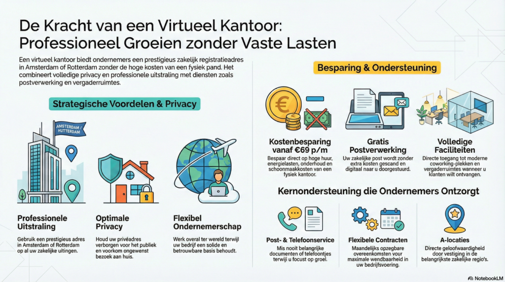 Een virtueel kantoor biedt ondernemers de uitstraling van een fysiek kantoor op een toplocatie (zoals Amsterdam of Rotterdam) zonder de hoge huurlasten. Het is de ideale oplossing om je privΓ©adres af te schermen bij de KvK, terwijl je profiteert van professionele postverwerking en toegang tot vergaderruimtes wanneer dat nodig is.